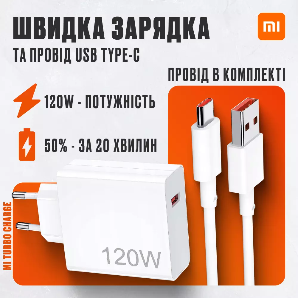 【Зарядний пристрій 120 Вт з кабелем USB Type-C довжиною 1 м для Xiaomi та Redmi】
